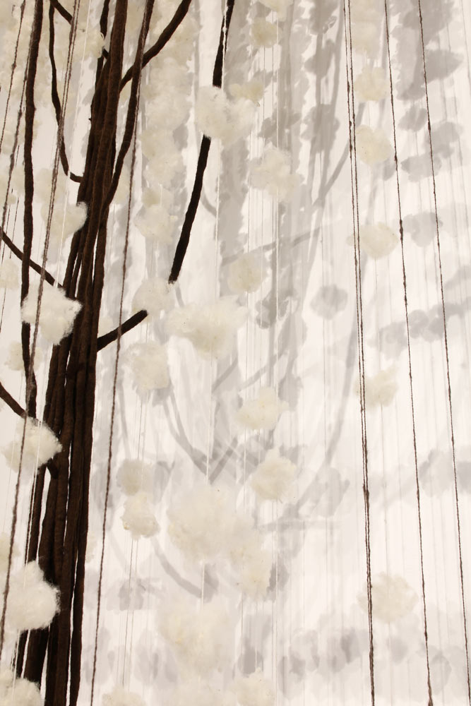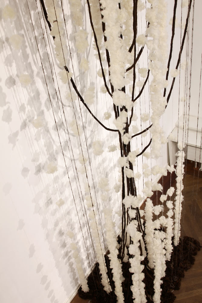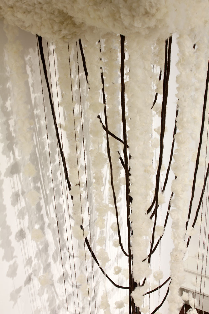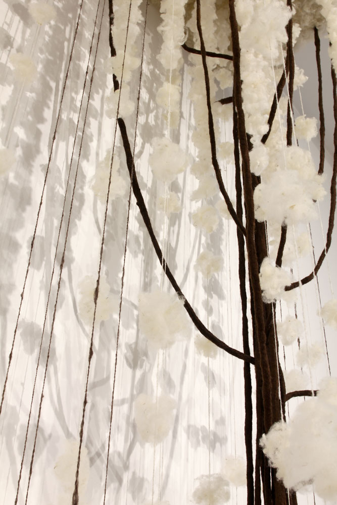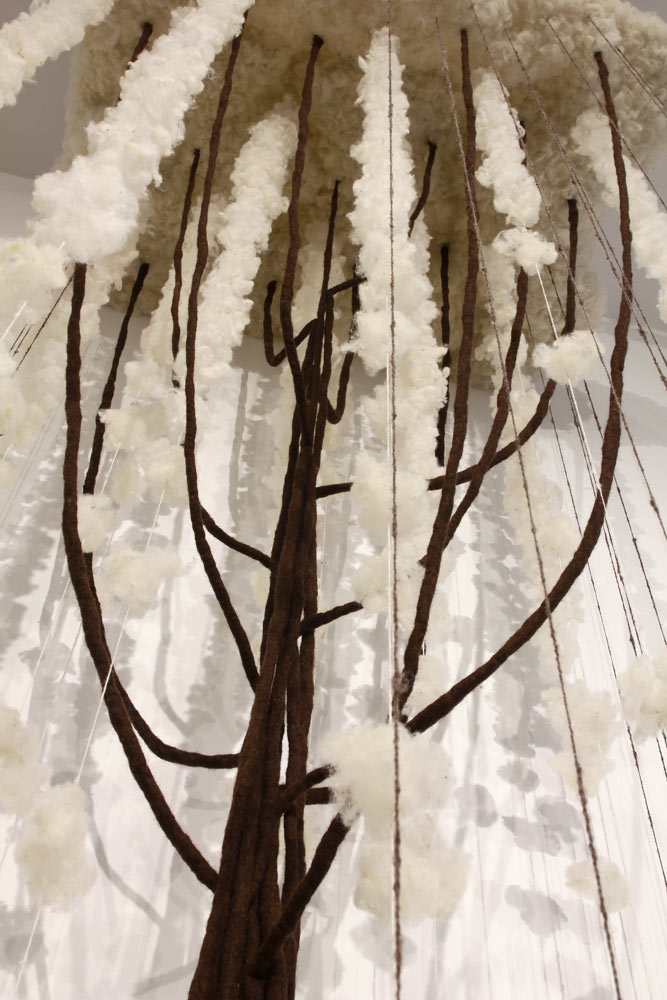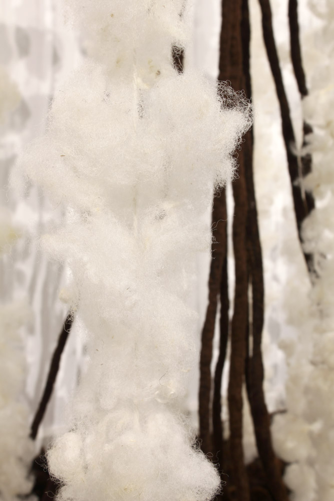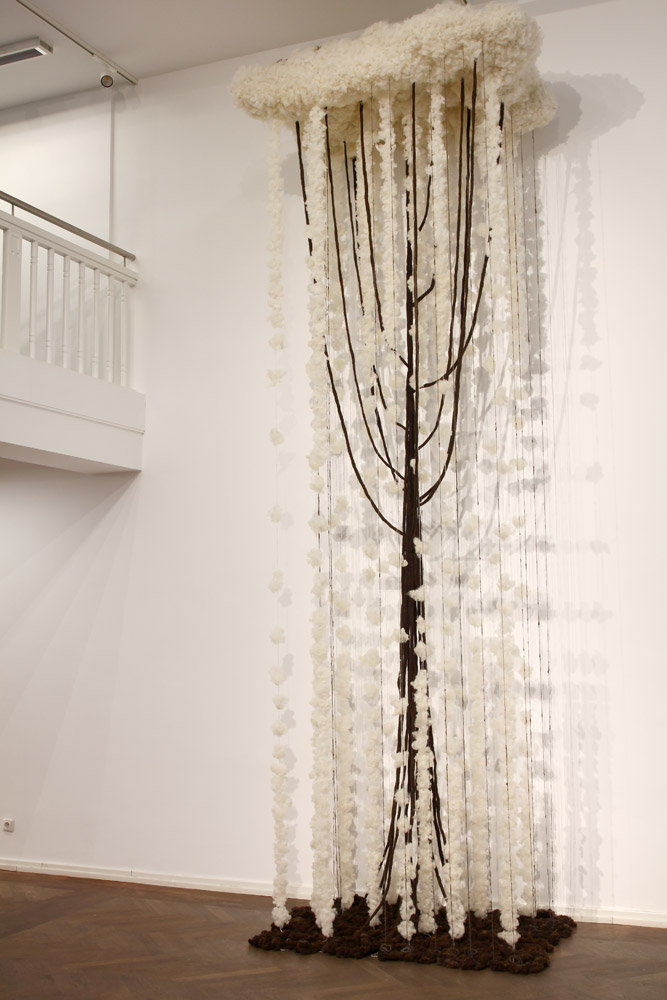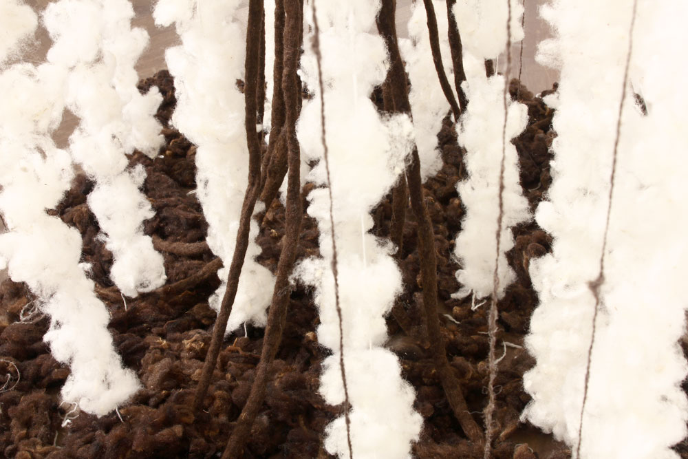Driver 2025 conceptinstallation Views of the installation in the exhibition „malatsion – A new harvest“, Heussenstamm-Stiftung, Frankfurt/Main, 2025. Timber, wire mesh, sheep’s wool felted, spun, plucked, 150 W x 100 D x 440 H cm.