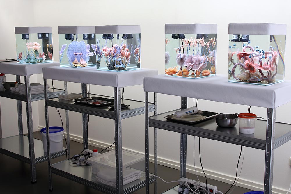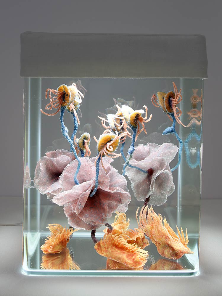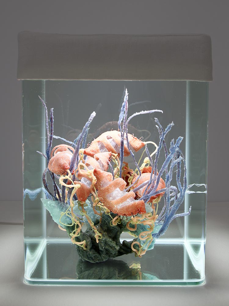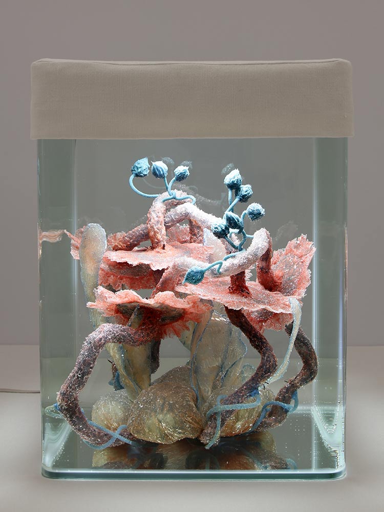 Installation for each holobiont: soft sculpture (silicone, stones, pigments) floating in water, aquarium, additive, lamp, pump, fabric cap, 33 x 25 x 25 cm.