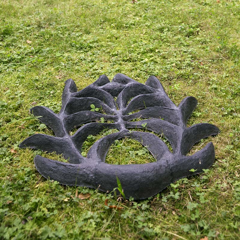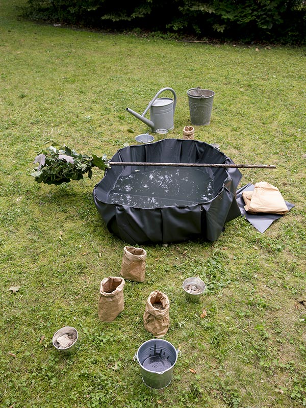 Klang- und Kunstperformance. Klanginstrumente, kompostierbare Holzkohle-Plastiken, Wasser, verschiedene mineralische und organische Materialien, Gartenwerkzeug.