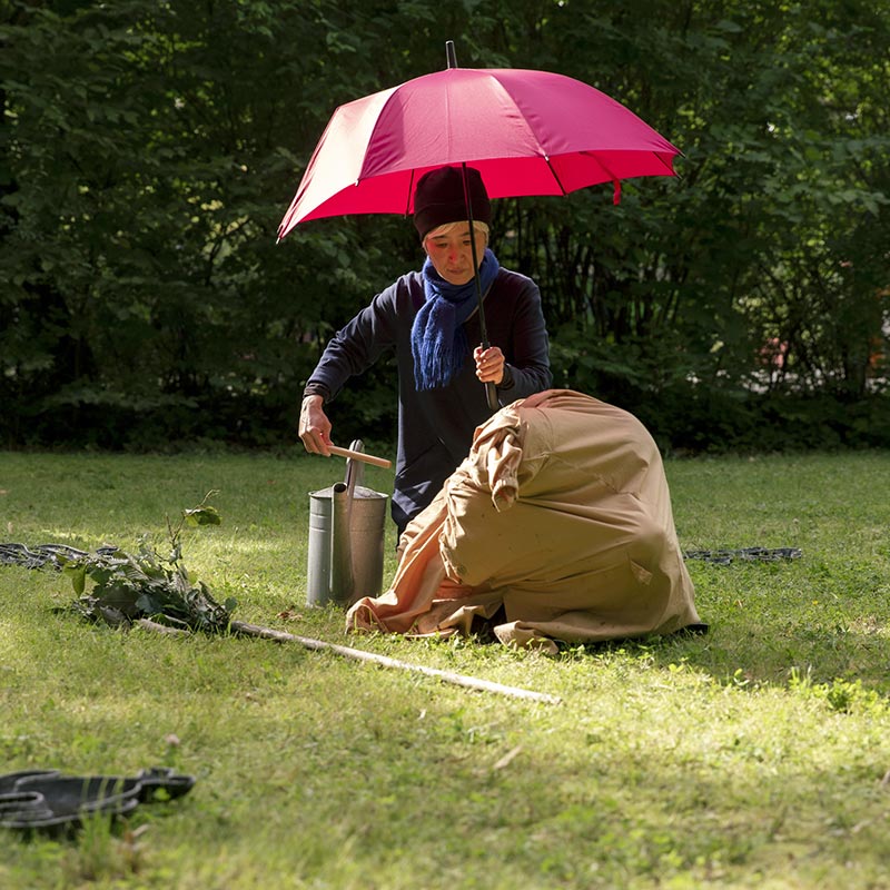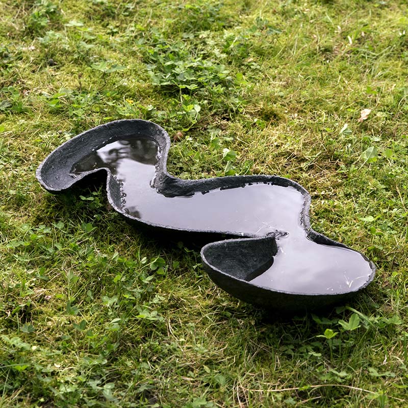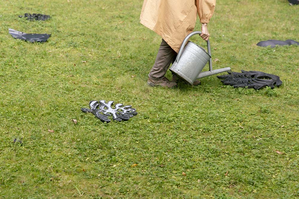 Sound and art performance. Sound instruments, compostable charcoal containers, water, various mineral and organic materials, garden tools.